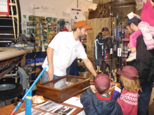 The Show was busy and we had many visitors throughout the 2.5 days (21 hours).  ON Saturday morning I gave a seminar which Show Organizers entitled, “Blind Fishing Intro — Punched UP!”.  Not quite the title I had in mind, (long story), but I thought it was pretty funny.  After the presentation I took Maestro, my guide dog, around to visit the simulated duck hunting game as he was keen on checking out the sound of ducks being blasted at the other end of the hall.  He seemed a bit disappointed when he figured out they were fake…