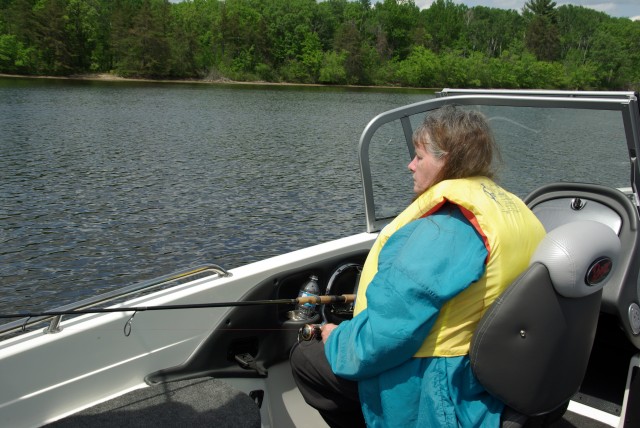 Within the first couple hours we had a half-dozen decent-sized fish in the livewell.  From that point on, Vicky’s responsibilities were expanded from trolling the twister tail and being in charge of the radio, to reeling in all fish hooked by Scott and I, including the second largest Pike of the day.