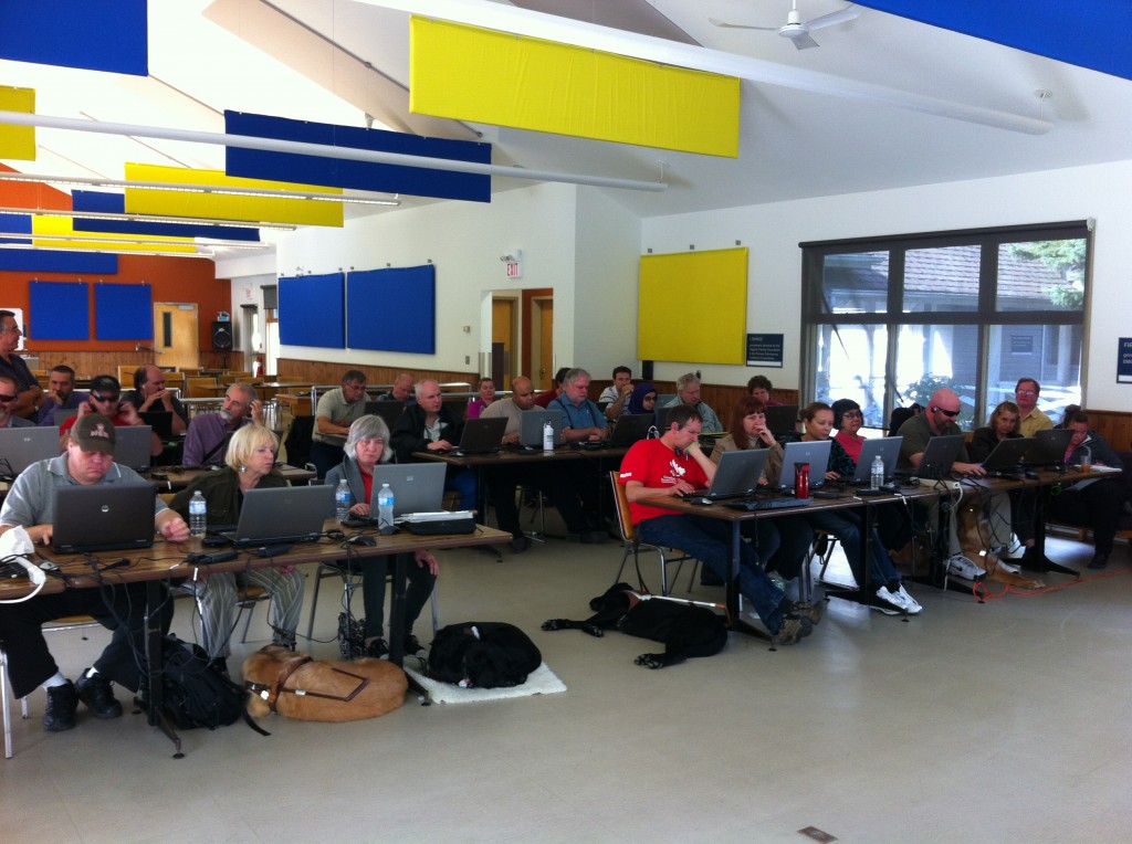 After almost a year of effort, in partnership with the CNIB Lake Joseph Centre, the first ever technology training program geared to blind professionals took place. 27 participants and over a dozen trainers and support staff from across Canada gathered for five days to take part in this unique event. Outputs from the training intended for sharing with others can be retrieved by searching for #LJT12 on Twitter. The below letter sent from the CEO of the CNIB to my deputy minister best explains the rationale for offering such a program and my involvement in its conception and organization. Please find pictures from the week posted at the end of the letter.Dear Deputy Minister John Knubley,I’m writing to let you know about the timely and valuable support an individual in your employ is providing the CNIB, and to bring to your attention a training opportunity employees with visual disabilities in your department and the government in general should find of benefit.Mr. Lawrence Euteneier, a manager in the Rural and Cooperative Secretariat at Agriculture Canada, in his volunteer position on the Board of Directors for the CNIB Lake Joseph Centre, proposed that the CNIB provide Canadian professionals with visual disabilities technology training. The training would both assist with career advancement and productivity by training such professionals to make the most of advancements in information and communication technologies.The CNIB has since made Mr. Euteneier chair of an Advisory Committee on Technology Training. Mr. Euteneier has considerable experience in this area having both served as the “Advisor on Technical Accessibility for the Senate of Canada, and by developing and deploying world-leading technology aimed at closing Canada’s digital divide experienced by people with literacy or disability issues. Mr. Euteneier’s receipt of the “Public Service Award of Excellence” and the Governor General’s “Meritorious Service Medal” further speaks to his expertise and commitment in this regard.