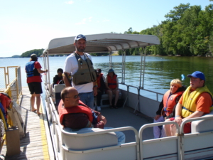Storms and a significant cold front had air temperatures dropping to between five and ten degrees Celsius each night and strong winds each day.  Fishing was more than a little challenging.  We were also using two of the CNIB’s boats, (one was a 20-foot fibreglass I/O drive and the other a 30-foot pontoon); however, neither was equipped with a sounder or trolling motor which made tracking down the Small Mouth Bass in Lake Joseph challenging.  I knew they would be down about 20 to 30 feet, suspending off humps and transition points, but finding these structures and then maintaining position over them was near impossible.  For some of the more boat-shy participants, doc fishing was the name of the game.