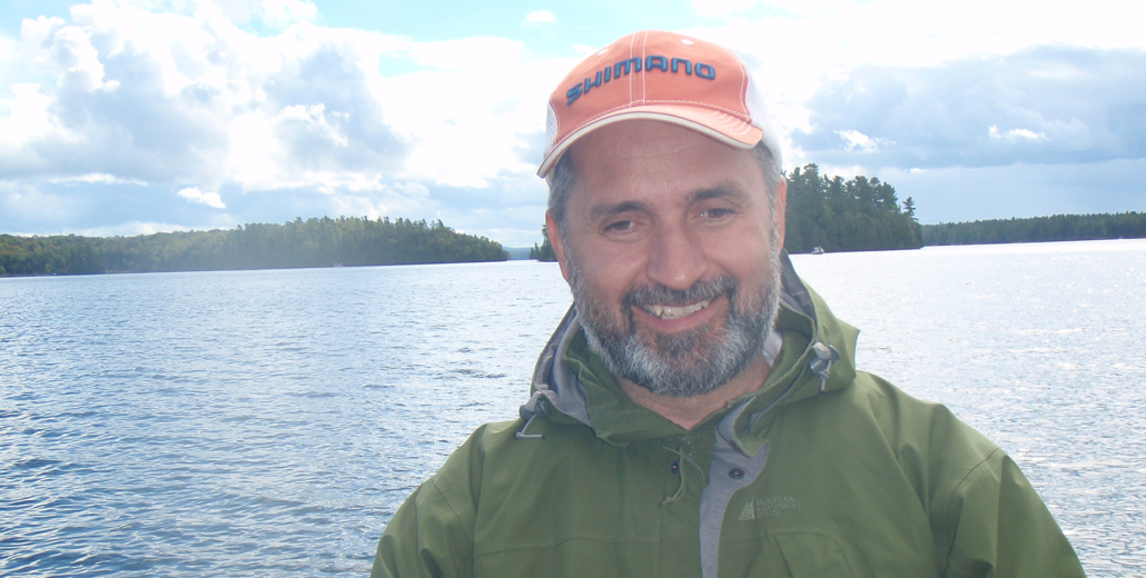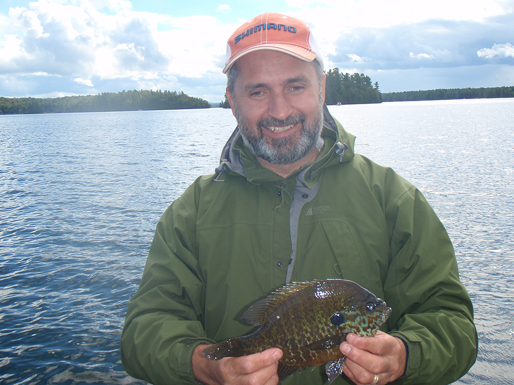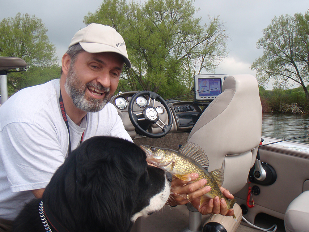 Lawrence showing his catch of a walleye to Moby