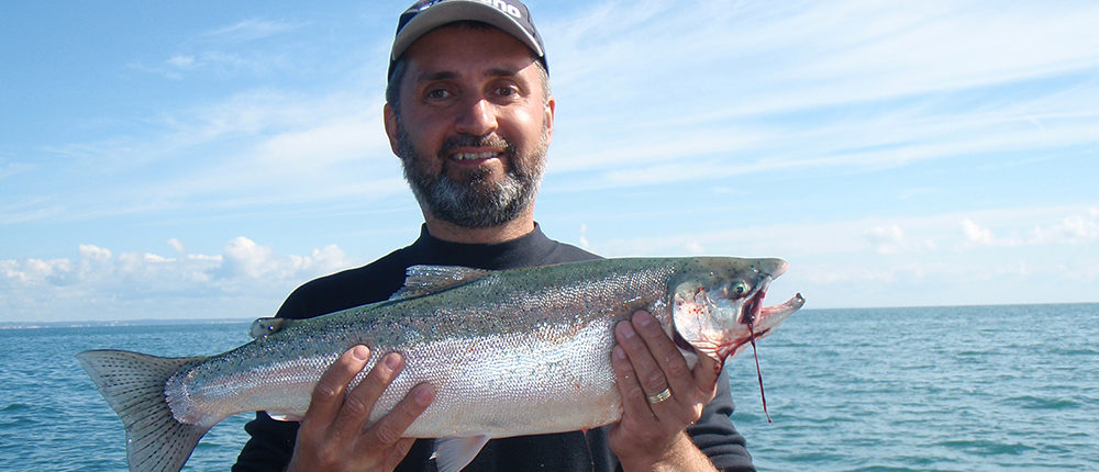 I first met charter captain Jean Robitaille at a fishing show in Toronto when he visited my Blind Fishing Boat booth. Jean operates out of the Darlington Marina at the mouth of Bowmanville Creek near Oshawa, and runs an 17.5′ Crestline equipped with an 115hp Evinrude and 8hp kicker. Clients hear of Jean’s service through word-of-mouth as he prefers fishing with those who know there way around a boat. The Crestliner offers a dry ride, but Lake Ontario is big so guests need to be open to a bit of “rock&roll”.