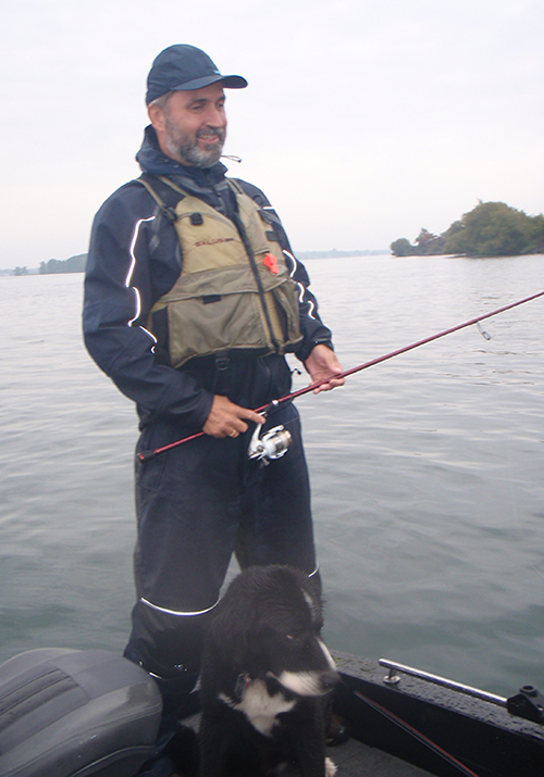 Lawrence and Moby fishing on the Ranger 620