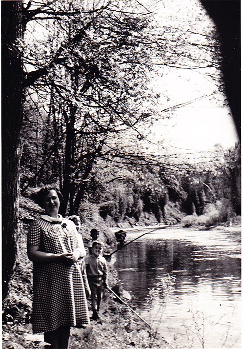 Lawrence’s mother standing on the edge of a river fishing with the boys using bamboo rods